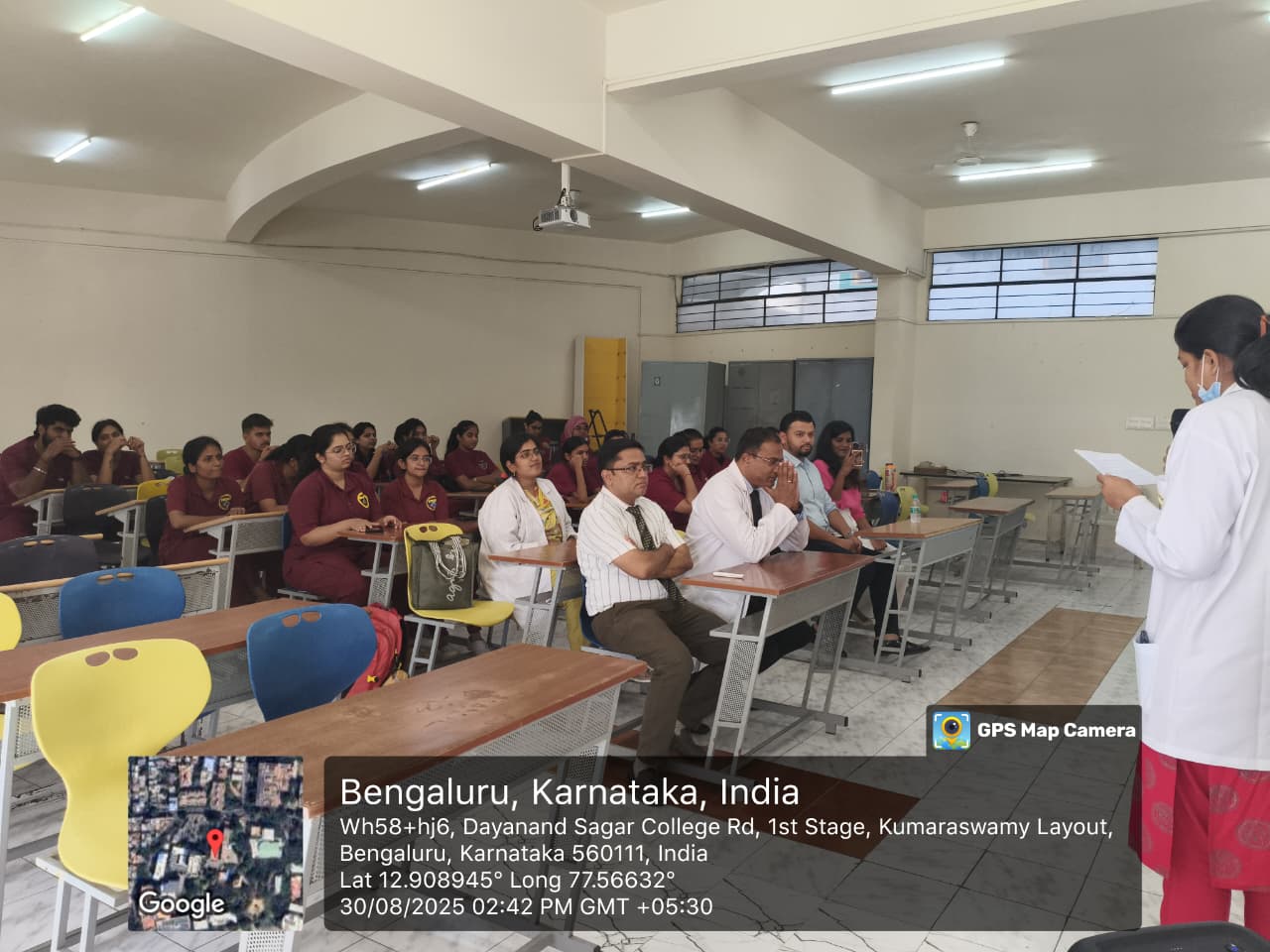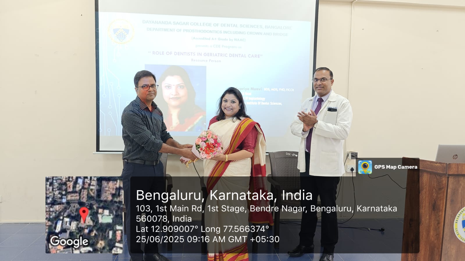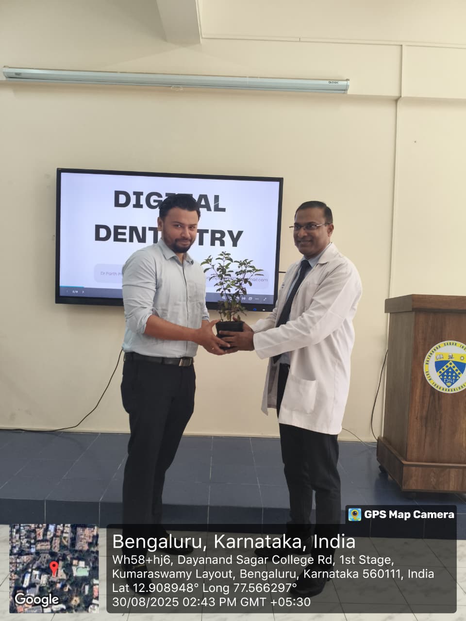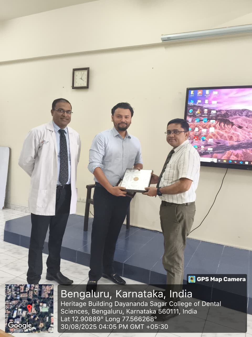 A Continuing Dental Education (CDE) program titled “Endocrowns Demystified – Lecture, Demonstration, and Hands-on" was organized by the Department of Prosthodontics (Crown and Bridge), Dayananda Sagar College of Dental Sciences, on 31 January 2026, commencing at 9:15 a.m. The program was coordinated and hosted by Dr. Shreyasee Maity, Senior Lecturer, Department of Prosthodontics. The event was attended by faculty members, postgraduate students, and interns from all departments of the institution. Dr. Hemanth M, Principal, Dayananda Sagar College of Dental Sciences, addressed the gathering and emphasized the relevance of advanced restorative dentistry, full-mouth rehabilitation, esthetic prosthodontics, and implant prosthodontics in contemporary dental practice. The resource person, Dr. Aparna Singhal, delivered a comprehensive lecture and clinical demonstration on extended E-max endocrowns, focusing on conservative and biomimetic restorative approaches with predictable long-term outcomes. The session included discussion of multiple clinical case presentations, highlighting modern prosthodontic solutions that integrate functional efficiency with esthetic outcomes. A hands-on demonstration using 3D-printed resin models was conducted for registered participants, enabling practical exposure to endocrown preparation and restoration concepts. The program concluded with an interactive question-and-answer session, followed by collection of participant feedback. The program concluded with a vote of thanks proposed by Dr. Suresh M. Nagaral.