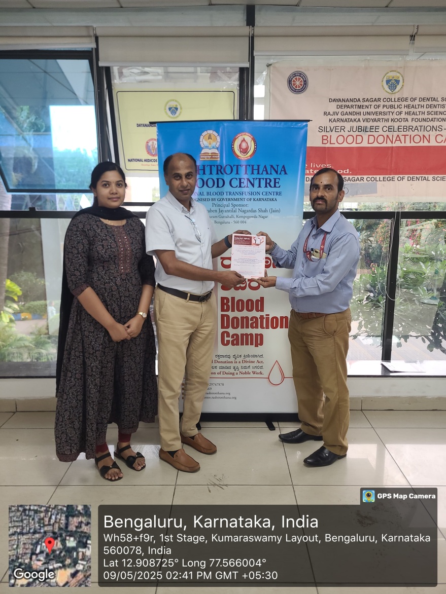 A mega blood donation camp was conducted on the 15th of September 2019 in Dayananda Sagar College of Dental Sciences as part of the NSS activity of the college. The program was in commemoration of the silver jubilee celebrations of our dental college. The camp was organized in association with Karnataka VidhyarthiKoota(KVK), an NGO associated with our dental college and its outreach activities. A team of doctors and technicians from the Sanjay Gandhi Trauma Hospital Blood Bank and Sagar Hospital blood bank were commissioned to do the needful. The programwas held at the Department of Oral and Maxillofacial Surgery, DSCDS and started off at 9.30 am and continued till 2.30pm. There were about 150 volunteers who registered for blood donation andwe were successfully able to collect 80 pints of blood from the enthusiastic volunteers.