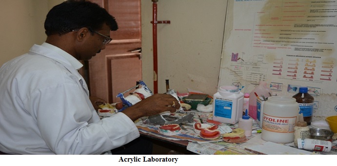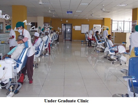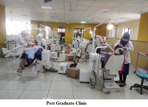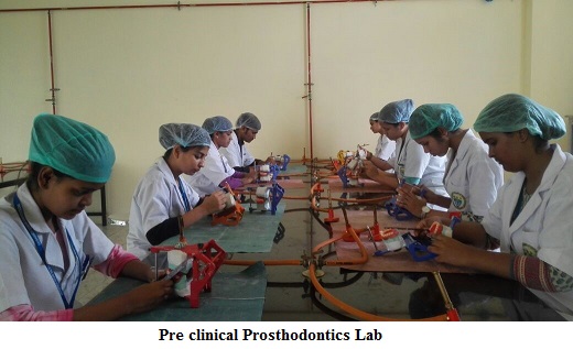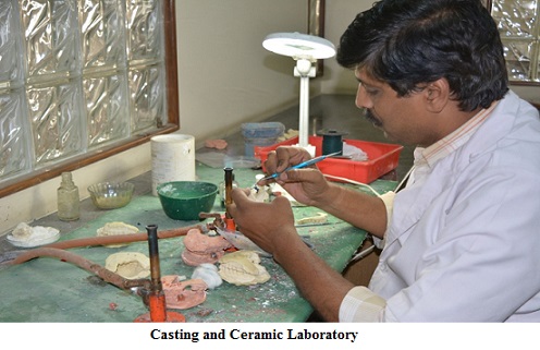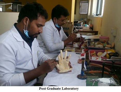 The department is spread over 8444 sq. ft of floor space with designated clinical training areas for under graduates and post graduate students. It accommodates 25 dental chairs, a sterilization room, seminar room with fully equipped audio-visual facility, PG laboratory, UG laboratory, acrylic laboratory, staff room and patient waiting area. There is a Department Library and a fully equipped casting and ceramic lab.